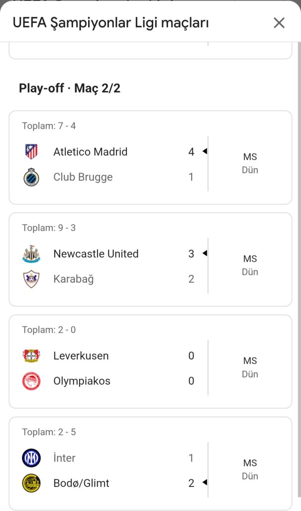 - İnter 1-2 Bodø/Glimt: Gecenin sürprizine imza atan Bodø/Glimt, deplasmanda İnter’i devirerek toplamda 5-2’lik skorla rakibini eledi.