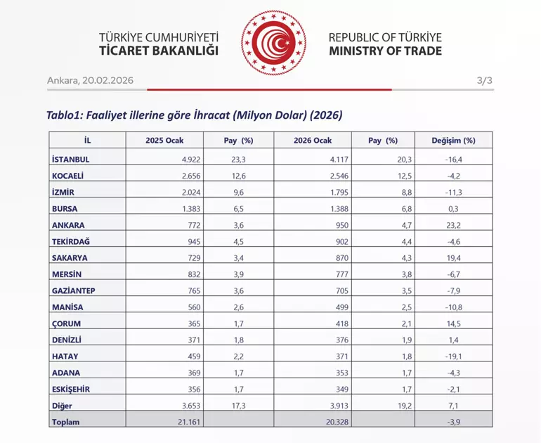Ticaret Bakanlığı, 2026 yılının ilk ihracat verilerini kamuoyuyla paylaştı. Küresel piyasalardaki dalgalanmaların etkisiyle toplam ihracat, geçtiğimiz yılın aynı dönemine göre %3,9’luk bir kayıpla 20 milyar 328 milyon dolar seviyesinde gerçekleşti. Genel toplamda bir düşüş yaşansa da Anadolu’nun sanayi devleri performanslarıyla dikkat çekti.