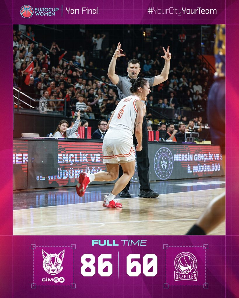 Mersin basketbolu tarihi günlerinden birini daha yaşıyor! Kadınlar basketbolunun Avrupa’daki iddialı temsilcisi Çimsa ÇBK Mersin, EuroCup Women yarı final mücadelesinde Fransız ekibi BLMA (Gazelles) karşısında parkeden 86-60’lık net bir skorla galip ayrılarak adını finale yazdırdı.